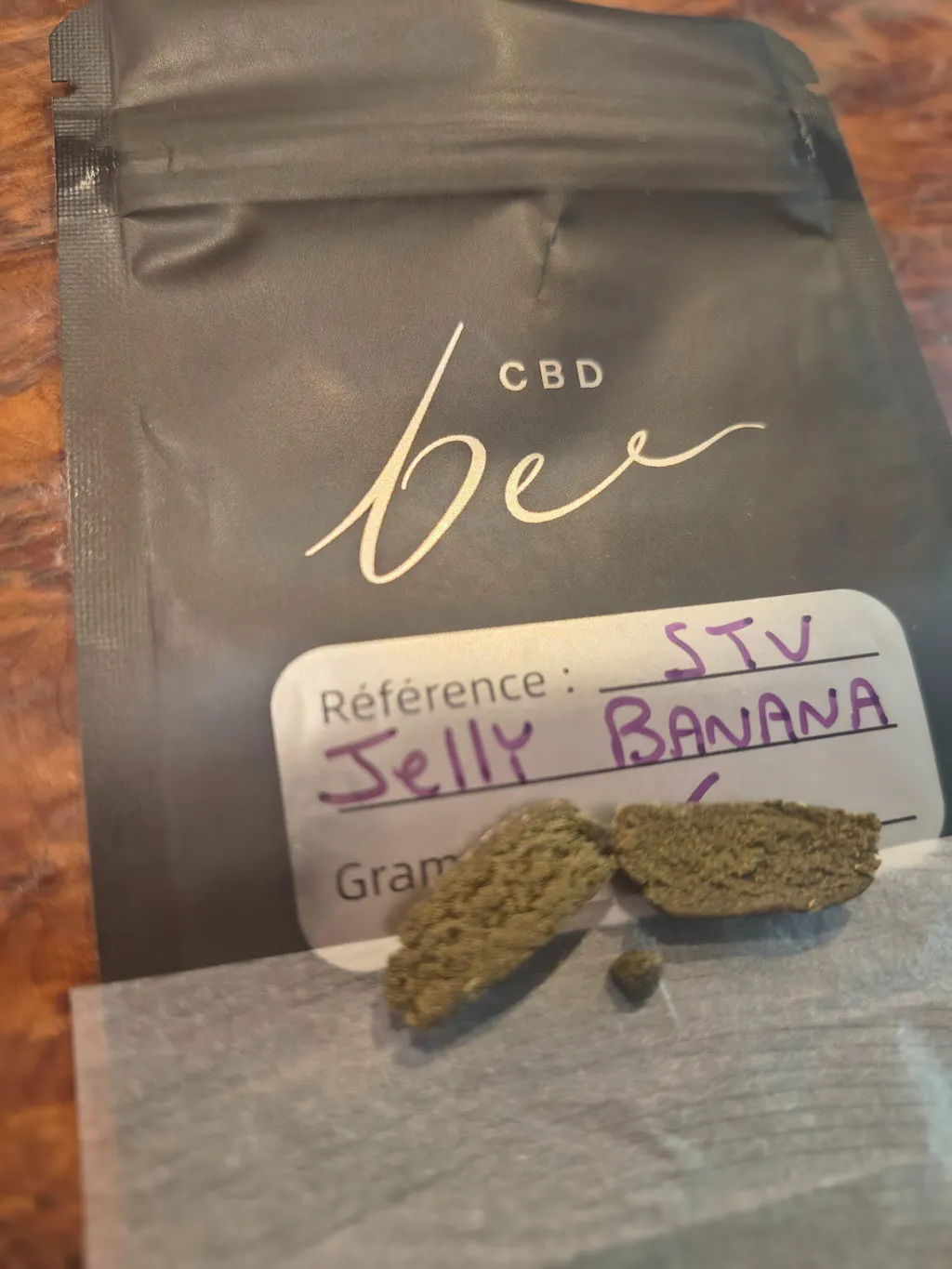 Cette résine est d'aspect marron profond / jaune avec des nuances plus vertes. Notre Jelly Banana STV est une résine compact, au tamis extrêmement fin et à la consistance légèrement grasse grâce à son enrichissement en Wax de CBD.